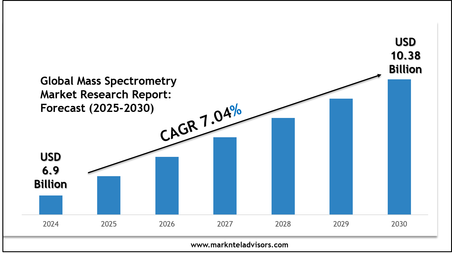 The Mass Spectrometry Marketsize was valued at around USD 6.9 billion in 2024 and is expected to reach USD 10.38 billion by 2030. Along with this, the market is estimated to grow at a CAGR of around 7.04% during the forecast period, i.e., 2025-30. The Global Mass Spectrometry Market is significantly growing due to several growth factors, including the rising public and environmental health concerns regarding sample analyses and food testing, the rising pharmaceutical industry, and the expansion of mass spectrometry infrastructure by heavy investments through the public and government sectors, the integration of advanced technologies such as artificial intelligence in the mass spectrometers, etc. One of the most prominent growth factors is the rising adoption of biologics manufacturing by the pharmaceutical and biotechnology companies, as these are highly efficient solutions for chronic diseases like diabetes, cancer, and autoimmune diseases. Biologics have complex structures, which are increasing the market demand.