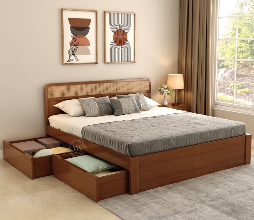 Wooden Street’s collection shines here, offering wooden double bed design that marry Indian craftsmanship with modern utility. Made from sustainable woods like mango or acacia, these beds are not only eco-friendly but also built to last, resisting wear in humid climates. Let’s look at standout options that prioritize space.