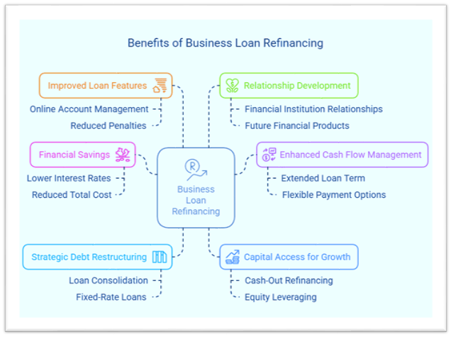 Refinancing a business loan means replacing the existing loan with a new one with fresh terms and interest rates. It involves getting a lower interest rate, smaller monthly payments, and a longer repayment structure. It is ideal to get one to manage the loan payment more easily. It helps improve business cash flow, lower the overall costs, and align the loan with the company’s current requirements.