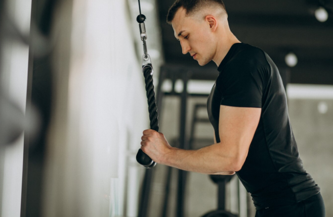 To finish off your upper body day, this is a good one. Stand in front of a cable machine. Hold the handle or rope and push it down until your arms are straight. Bring it back up with control. Don’t let your elbows flare out.